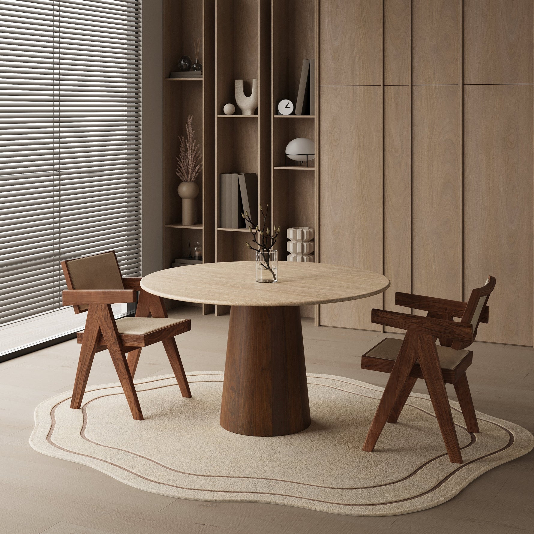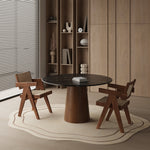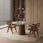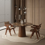 Ten nowoczesny okrągły stół jadalniany łączy elegancki design z wyjątkową trwałością. Drewniana podstawa w formie cylindra nadaje stołowi nowoczesny, naturalny charakter, który podkreśla piękno i wyrafinowanie użytych materiałów.