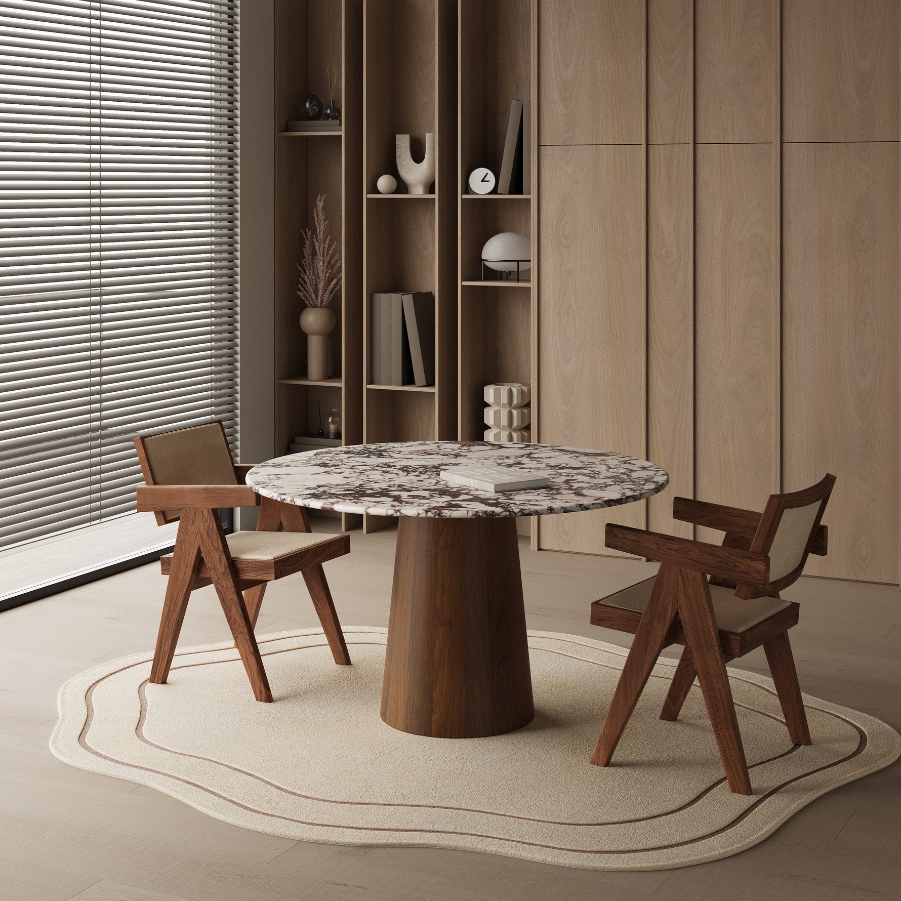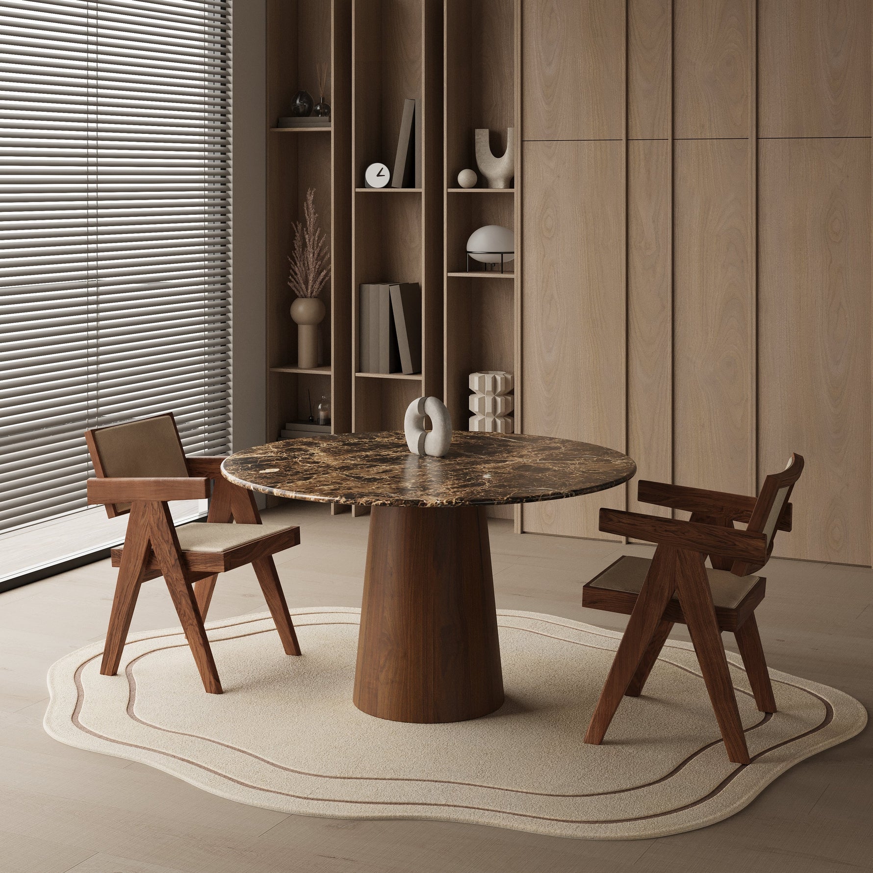 Stół wykonany jest z wysokiej jakości drewna oraz marmuru, dzięki czemu jest niezwykle trwały i odpowiedni do intensywnego użytkowania. Powierzchnia stołu jest łatwa w utrzymaniu czystości i sprawdzi się w różnych sytuacjach — od rodzinnych kolacji po pracę nad projektami.